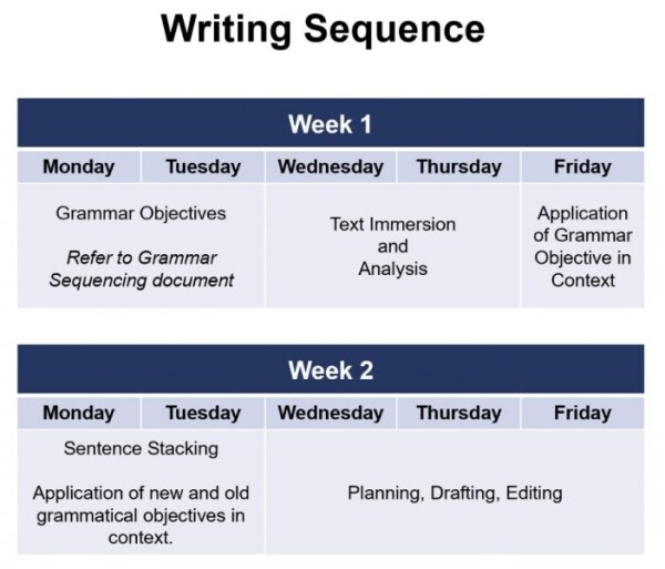 Grammar objectives are taught explicitly at the start of a writing unit. These skills are initially taught out of the text type context to reduce the cognitive load on children. These skills are then applied within the text type context following text immersion and analysis.