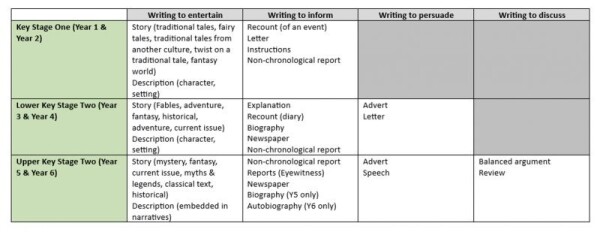 Writing genres have been planned out across Key Stage 1, Lower Key Stage 2 and Upper Key Stage 2. Key Stage One focus on ‘Writing to entertain’ and ‘Writing to inform’ only. These strands are also repeated in lower and upper key stage two. ‘Writing to persuade’ is introduced in Lower Key Stage Two and ‘Writing to discuss’ is introduced in Upper Key Stage Two.